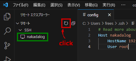 エクスプローラーのリモート項目にマウスカーソルを持って行くかまたはクリックすると更新ボタンが表示されるのでクリックします。