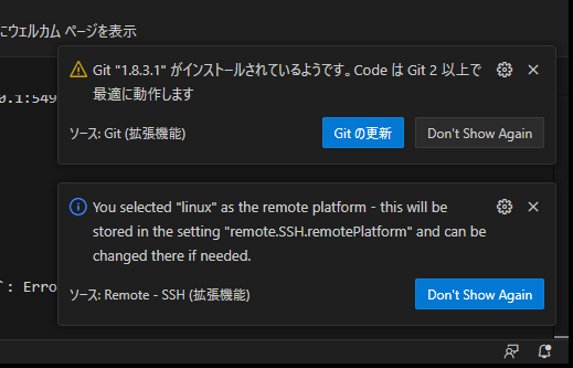 僕の前記事通りの環境の場合、初回ログインした際に画面右下にメッセージが表示されます。
