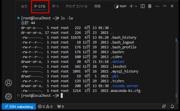 Remote – SSH で接続したため .vscode-server ディレクトリが作成されているのがわかります。