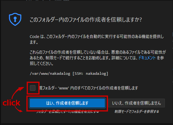チェックを入れ、はい、作成者を信頼しますボタンを押下してください。