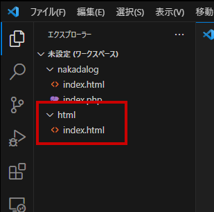 また一覧の先頭に未設定(ワークスペース)が表示され、その配下に nakadalog フォルダとこの度追加した html フォルダが紐づいていることがわかります。
