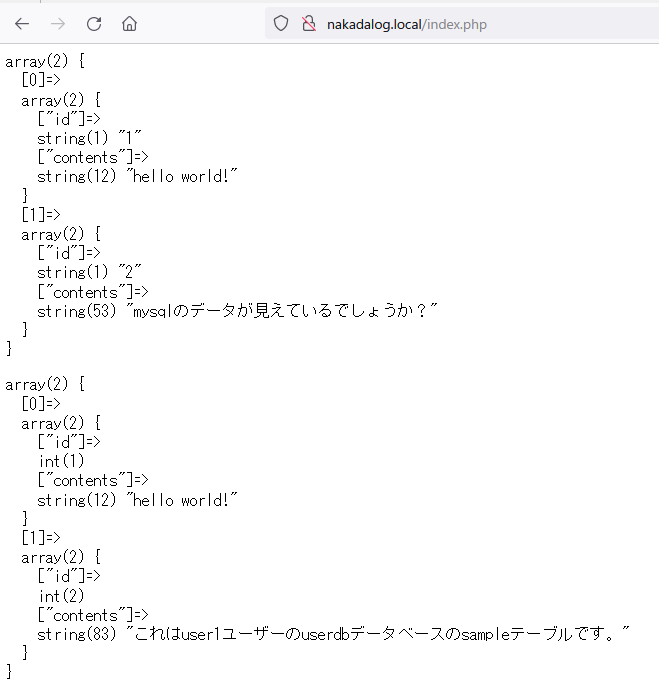 プログラムに書いた通り、MySQL と PostgreSQL に接続して select 文を実行しデータを取得した上で var_dumpで出力されています。
