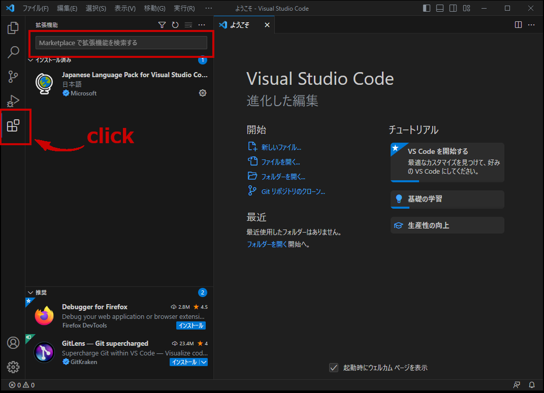 VSCodeを立ち上げて左メニューにある拡張機能アイコンをクリックします。